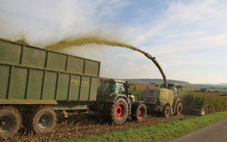 Unsere Maishäckselkette wird angeführt vom Claas Jaguar 970 und begleitet von verschiedenen Schleppern (Fendt, New Holland, Deutz) sowie Trailern (Fortuna, Briri, Joskin). Auf Wunsch übernehmen wir ebenso das Schieben der Miete.